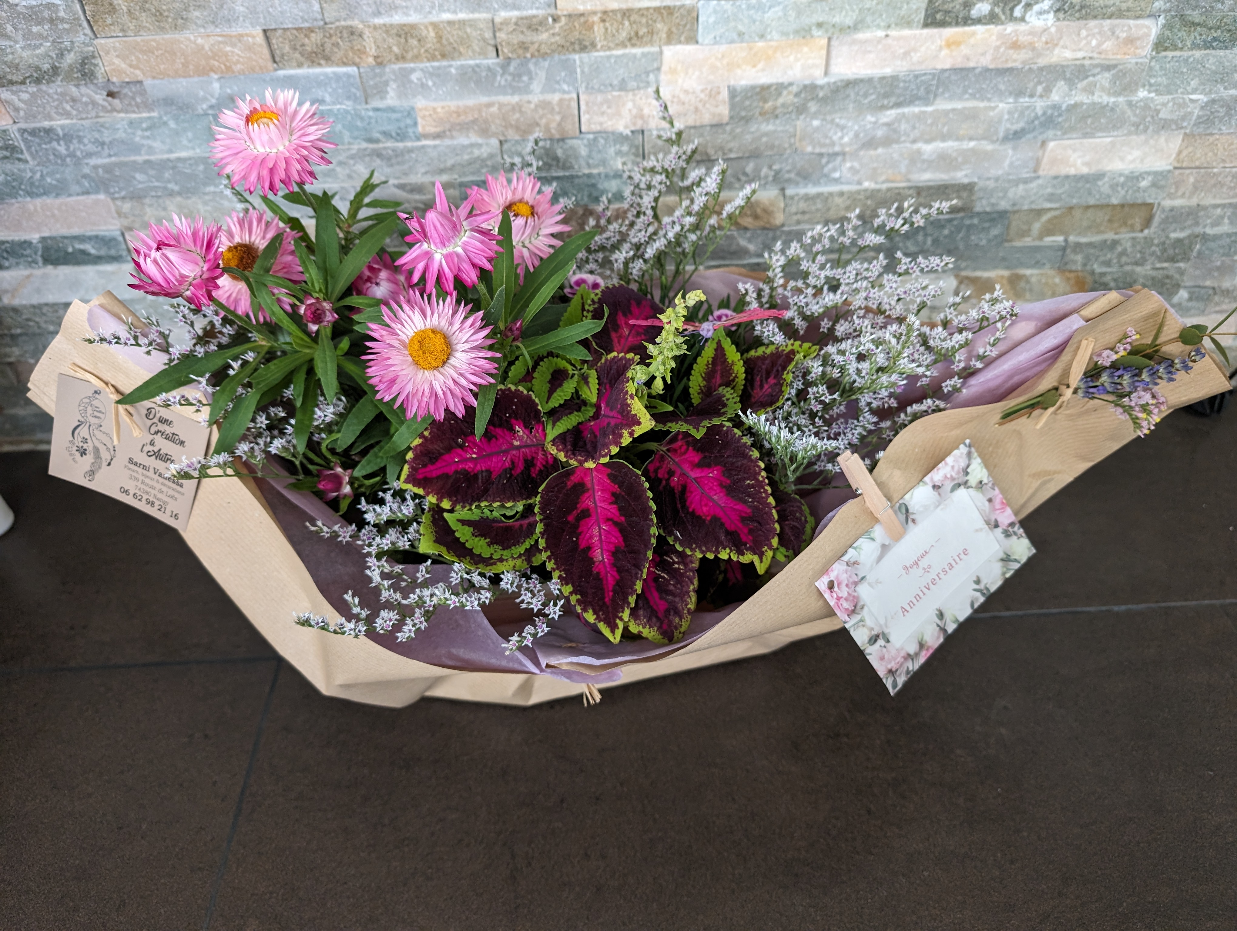 J'ai reçu cette jolie composition pour mon anniversaire. C'est une amie qui n'habite pas dans la région qui me l'a offert. Cette magnifique composition est arrivée directement à mon domicile. Je peux même les replanter. Je viendrai sûrement commander mes fleurs dans votre boutique. Je vous remercie pour cette composition qui est très jolie.